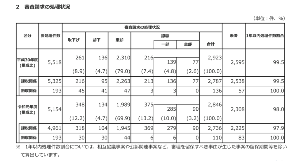 下記は国税不服審判所での審査状況ですが、平成30年度は勝率7.4%、令和元年度は勝率13.2%です。